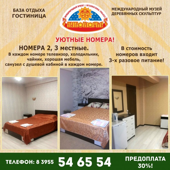 Уважаемые гости! С 25 июля на базе отдыха #ЛУКОМОРЬЕ, где расположен уникальный международный музей деревянных скульптур, начала свою работу ГОСТИНИЦА! ✅ К вашему удобству предлагаем благоустроенные, комфортные 2, 3 местные номера в отдельно стоящем здании. ( и это ещё не всё ) |