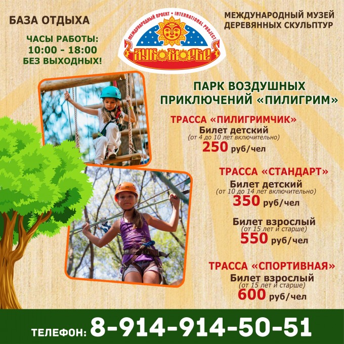Парк воздушный приключений "ПИЛИГРИМ" начал работать! Общая протяженность веревочной трассы 350 метров, высота 7-9 метров. Любителям острых ощущений придется преодолеть трассы, |