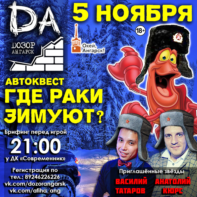 ВНИМАНИЕ! В эту субботу, 5 ноября, состоится увлекательная квест-игра Ночного Дозора «Где раки зимуют?». Впервые в заезде по ночному Ангарску примут участие признанные эксперты в сфере развлечений АНАТОЛИЙ КЮРС и ВАСИЛИЙ ТАТАРОВ!