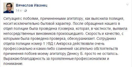 История о нападении группы неизвестных мужчин на агитатора кандидата в думу Ангарского округа Иркутской области от КПРФ Вячеслава Иванца была вымышленной; на самом деле побои ему нанесла знакомая девушка детским горшком, сообщил корреспонденту ИА «БайкалПост» 16 сентября источник в органах власти. ( и это ещё не всё ) |